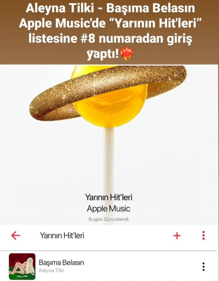 Çıkardığı her şarkısı ile müzik listelerinin ilk sırasında yer alan dinlenme rekorları kıran, Aleyna Tilki yeni şarkısı “Başıma Belasın” ile çıktığı an itibariyle Apple Music’de “Zirvedekiler Türkiye” Listesine ilk sıradan, Spotfy “New Music Friday Türkiye” Listesine 2 Numaradan, Apple Music “Yarının Hit’leri” listesine 8 Numaradan giriş yaparak giriş yaptı.