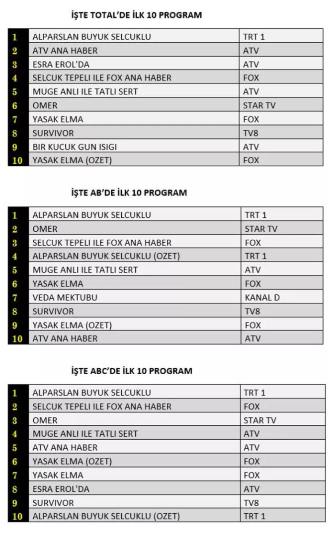 AB'de ise 1.sırada “Alparslan Büyük Selçuklu”, 2.sırada Star TV’de yayınlanan “Ömer”, 3.sırada “Selçuk Tepeli İle Fox Ana Haber” yer aldı.