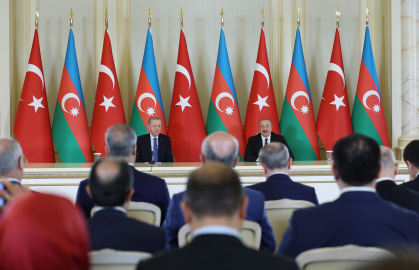 Cumhurbaşkanı Recep Tayyip Erdoğan, Bakü’de Cumhurbaşkanı Aliyev’le bir araya gelerek önemli açıklamalarda bulundu. Erdoğan, "Türkiye ve Azerbaycan iki kardeş ülke. İki devlet, tek millet anlayışıyla bugüne kadar yürüdüğümüz bu yolda, bundan sonra da kararlı bir şekilde yolumuza devam edeceğiz"dedi.