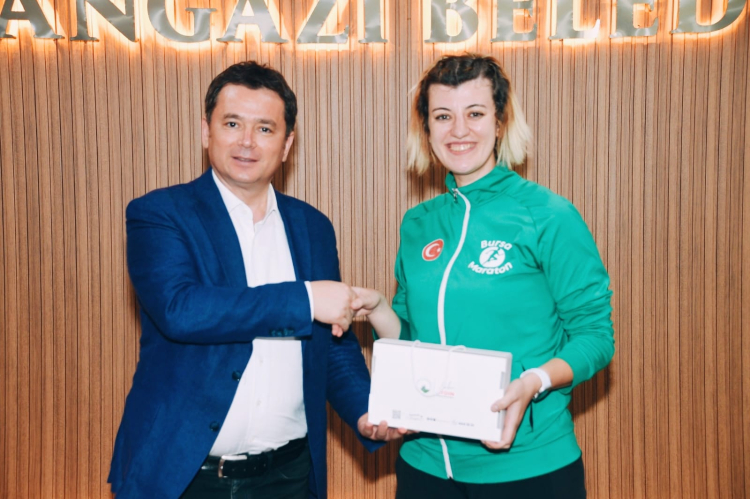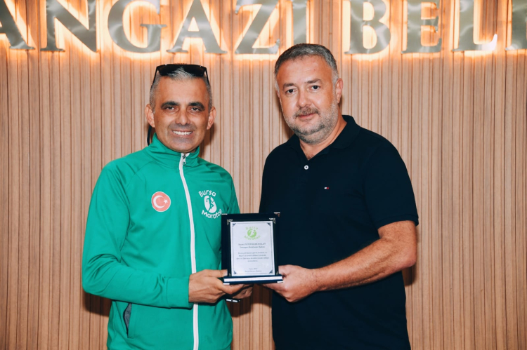 Osmangazi Belediye Maraton Takımı sporcuları Osmangazi Belediyespor Başkanı Fatih Karayılan’a da plaket takdim etti.