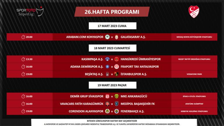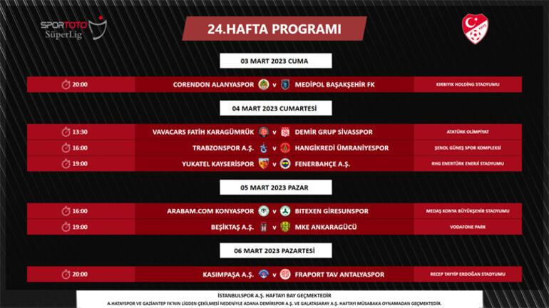 Bununla birlikte, deprem felaketinden dolayı ertelenen Spor Toto Süper Lig 23. hafta müsabakalarından Bitexen Giresunspor - Yukatel Kayserispor ve Fenerbahçe A.Ş. - Arabam.com Konyaspor müsabakaları 25 Şubat Cumartesi günü saat 19.00'da, HangiKredi Ümraniyespor - Adana Demirspor müsabakası ise 26 Şubat Pazar günü saat 16.00'da oynanacaktır.