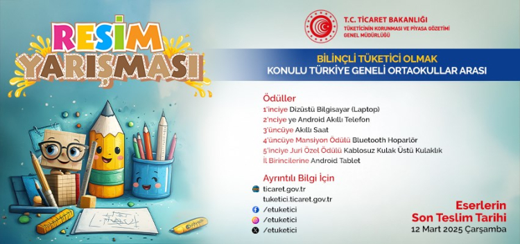 Eğitim çağındaki çocuklarımızı ve gençlerimizi bilinçli tüketim ve tüketici hakları konusunda bilinçlendirmek, farkındalık oluşturmak, sanatsal çalışmalarını desteklemek, değerlendirmek, sergilemek ve kalıcı eserler bırakmaya özendirmek amacı ile Ticaret Bakanlığı Tüketicinin Korunması ve Piyasa Genel Müdürlüğümü 2024-2025 Eğitim Öğretim yılı içerisinde “Bilinçli Tüketici Olmak” konulu, ülke çapında tüm okulların, ortaokul 5.6.7 ve 8. sınıf öğrencileri için resim yarışması düzenleniyor.