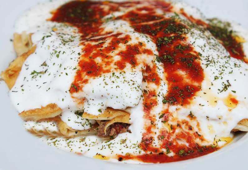 Üzerine çırpılmış yoğurt ve eritilmiş toz kırmızı biberli tereyağı dökerek servis edin.